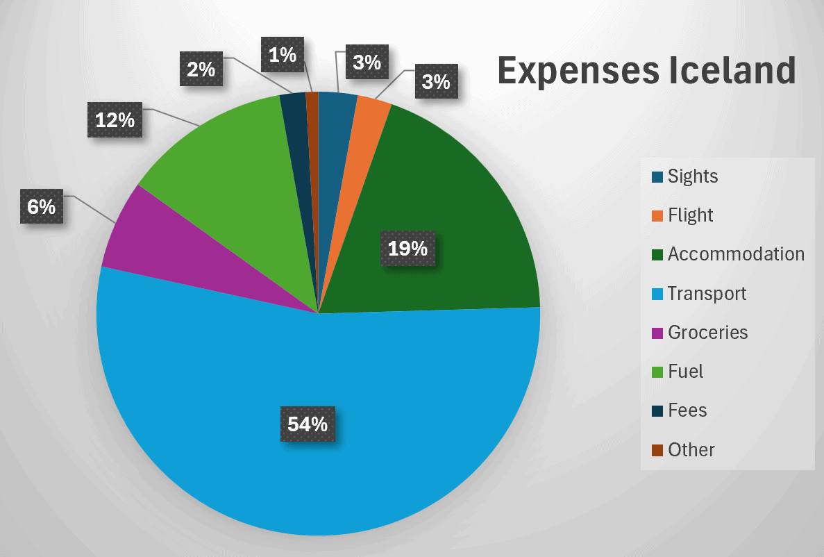 Iceland is an expensive destination and with costs of just under €9,000, it's tearing a hole in my budget. Half of the expenses are for the rental car and a significant portion is the expensive fuel (approx. €1,100). Of course, it didn't help that I drove 9,000 km. By comparison, I spent half a year in New Zealand for around €13,300 and drove 10,000 km. In 2023/24, the world was cheaper. A better comparison is this: deducting the rental car in Iceland and excluding flights for both trips. Then 2 months in Iceland cost around €4,400 and 6 months in NZ around €10,500; in other words, 1 month in Iceland €2,200 and 1 month in NZ €1,750. This also reinforces my conclusion. New Zealand is probably the perfect country to embark on your first Working Holiday. The visa isn't the easiest to get, but you'll be greeted with “stable” weather, beautiful scenery and fair prices. In New Zealand, you can find nice campsites for less than €10. In Iceland, you pay at least €10 (more like €15) for an uneven spot with a toilet... The price of electricity is also extortionate, at a minimum €10.50, even though Iceland has an electricity price of less than 20 cents per kWh (as of October 2025). In other words, €10 buys you 50 kWh and you really must try hard to use 15 kWh when camping... Of course, the minimum wage is higher in Iceland, but I don't understand why there is a minimum 50% surcharge for camping and parking. Nevertheless, Iceland is still a wonderful experience. If you want to see everything, I suggest a trip lasting 5 – 6 weeks. Either early September to mid-October, or if you don't mind missing out on the Northern Lights, early May to mid-June are the preferred travel times.